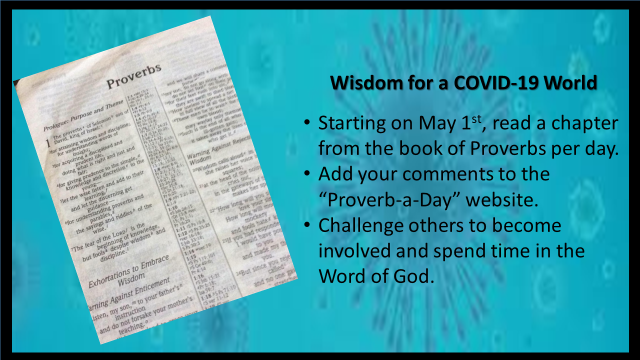 Welcome to Proverb-a-Day, the “Wisdom for a COVID-19 World” edition. It’s been my habit for many years to take advantage of a month with 31 days to read through the book of Proverbs. This year it seems to be a worthwhile exercise as we live in a world of self-isolation and government-enforced quarantine, as the world faces a global pandemic that has resulted in the death of over 250,000 people. What does the Word of God have to say to us in this situation?